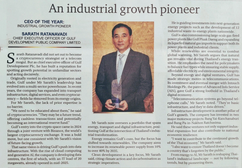 The prestigious award, themed “Leading at the Edge,” highlights Mr. Sarath’s transformative leadership in evolving GULF from an energy powerhouse into a multi-sector conglomerate. His strategic expansion into digital infrastructure—marked by the 2024 cryptocurrency joint venture with Binance and the 2025 launch of GULF’s first 20MW data center—underscores a bold vision for Thailand’s future-facing economy.