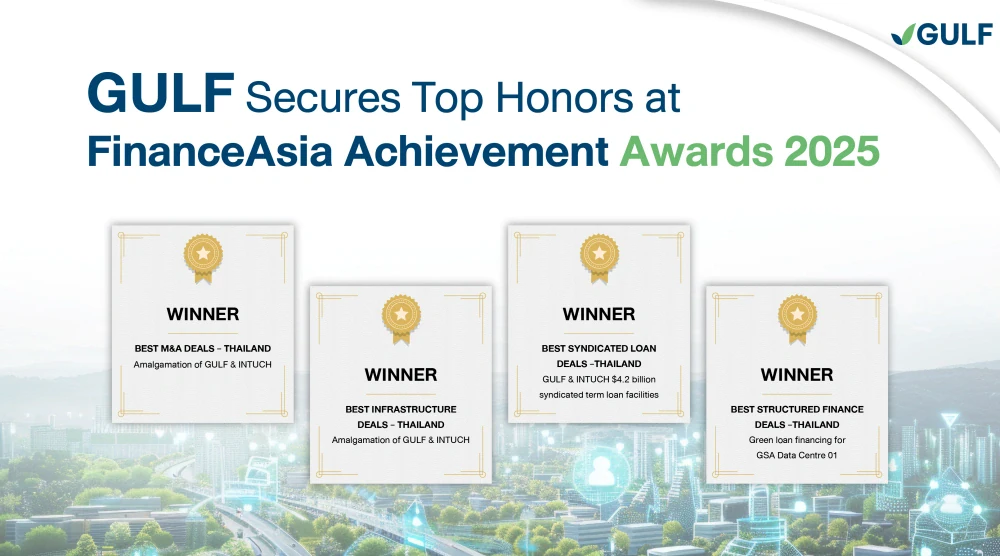 Gulf Development Public Company Limited (GULF) has achieved remarkable success on the international stage, securing four prestigious awards from the FinanceAsia Achievement Awards 2025. This recognition underscores its leadership in regional finance and infrastructure. The company was awarded Best M&A Deal – Thailand and Best Infrastructure Deal – Thailand for the landmark strategic amalgamation between Gulf Energy Development Public Company Limited and Intouch Holdings Company Limited (INTUCH), as well as Best Syndicated Loan Deal – Thailand for its US$4.2 billion loan facility. Furthermore, GULF secured the award for Best Structured Finance Deal – Thailand for the THB 7.295 billion green loan financing of GSA Data Center 01. These achievements reaffirm GULF’s commitment to sustainable growth and its vision to become a fully integrated energy and digital infrastructure leader, paving the way for long-term value creation.