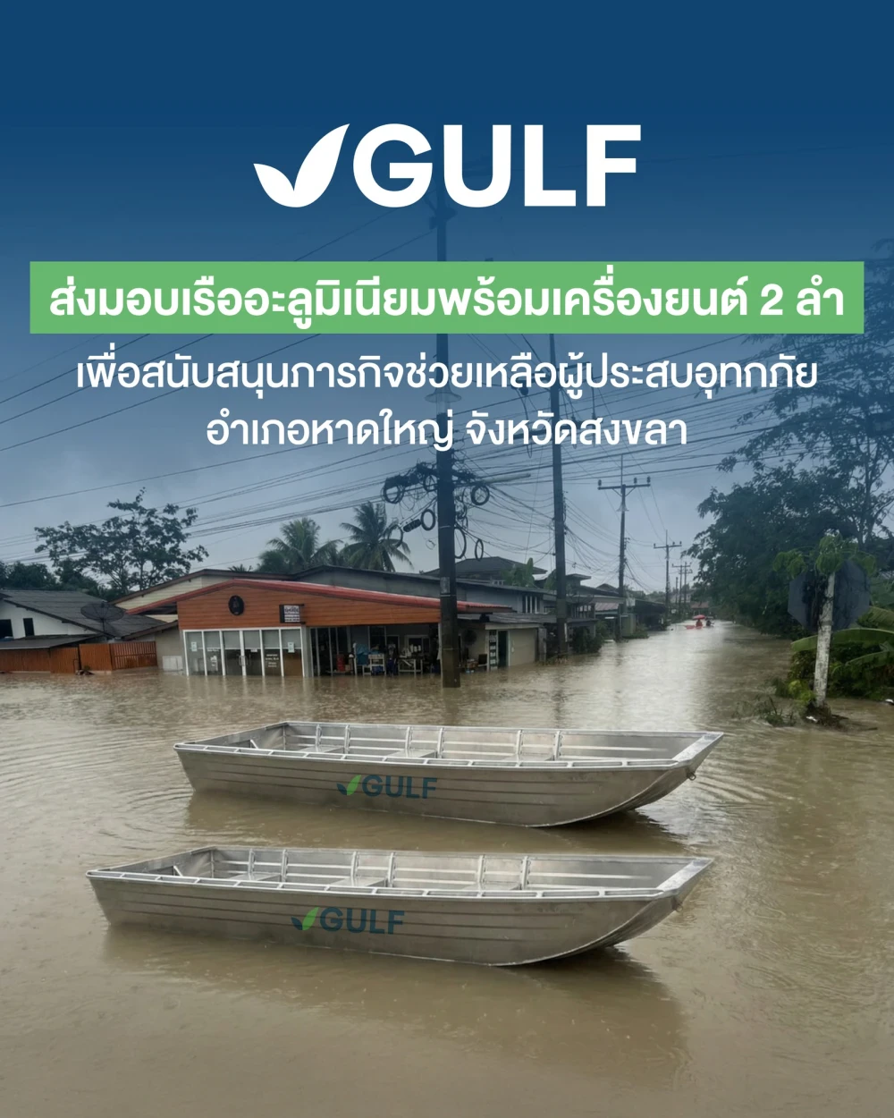 นอกจากนี้ ทีมกัลฟ์อาสายังลงพื้นที่ อ.จะนะ จ.สงขลา เพื่อส่งมอบถุงยังชีพ GULF Care อีกจำนวน 8,000 ชุด ให้พี่น้องประชาชนที่ได้รับผลกระทบจากน้ำท่วมในพื้นที่ อีกทั้งยังได้สนับสนุนเรือท้องแบนพร้อมเครื่องยนต์ จำนวน 2 ลำ เพื่อใช้ในภารกิจช่วยเหลือพี่น้องประชาชนผู้ประสบภัยน้ำท่วม อ.หาดใหญ่ จ.สงขลา อีกด้วย